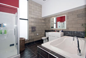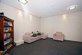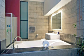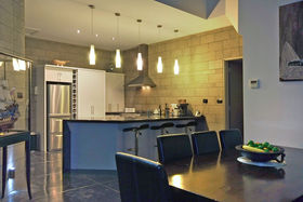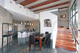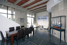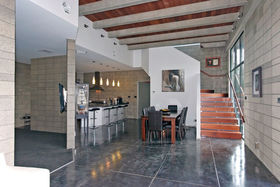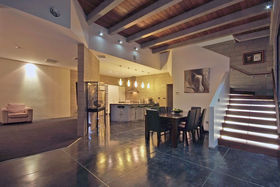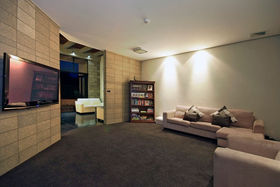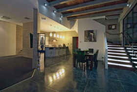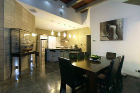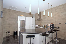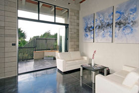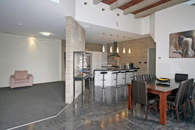 High stud with floor to ceiling windows, Jarrah wood ceiling features, and polished "roman" style flooring, featuring solid concrete block construction with a large open plan kitchen/dining area, a media room and the master bedroom with en suite and walk in robe is a well designed retreat from the main house.